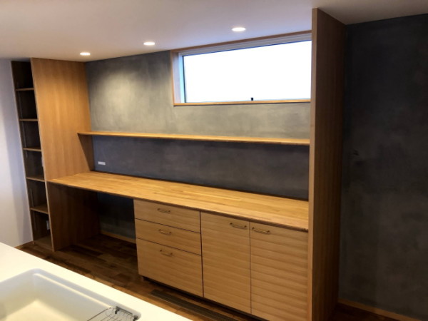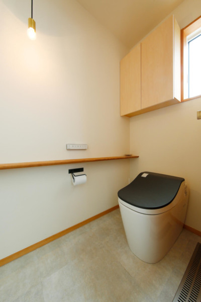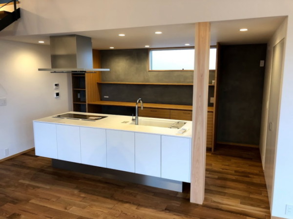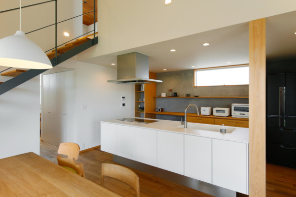 リビング・ダイニングを田んぼに近い南東の隅に配置し、大きな開口部を設ける事で、リビングに座ると庭と田んぼが繋がり、田んぼの広がりが空間の延長となるよう設計しました。さらにキッチンに立つと庭や田んぼの風景を眺める事が出来ます。キッチンは対面式のオープンにする事で、リビング・ダイニングの様子が分かります。