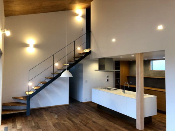建主の要望により、鉄骨階段がリビングから見えるようにとの事でしたので、リビング・ダイニング上部に吹抜けを設け、鉄骨階段の全体が見えるよう設計しました。