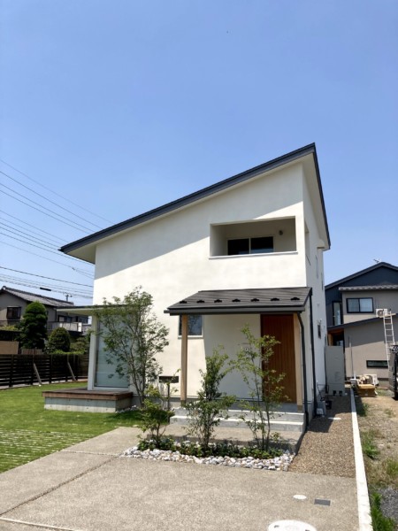 敷地の北東に建物を配し、南の庭を広く取り、1階に採光を得られるようにしました。駐車しやすいよう、幅の大きい東道路側に駐車スペースを取り、東に玄関を設けました。幅の狭い南側の道路は見通しが悪かった為、南側道路への行き来は塀で遮り、子供の飛び出し事故を防ぐようにしました。